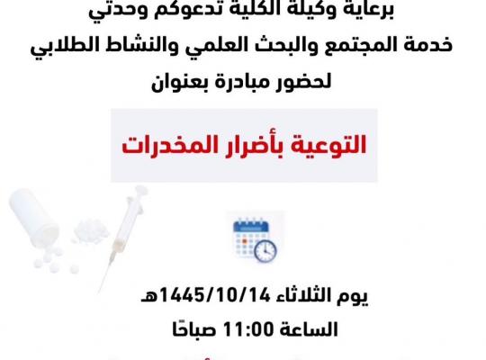 جامعة جازان: إدارة الإعلام في إطار حرصها على توعية الطالبات والمحافظة عليهن من أي مخاطر فعلت كلية الفنون والعلوم الإنسانية برعاية وكيلة الكلية الدكتورة غادة ذبالي مبادرة توعوية تحت شعار " التوعية بأضرار المخدرات" والتي نفذتها وحدتي خدمة المجتمع