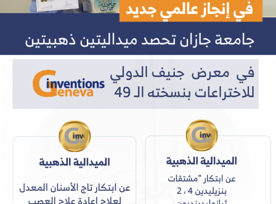 جامعة جازان: إدارة الإعلام حصدت جامعة جازان ميداليتين ذهبيتين على مستوى العالم وذلك خلال مشاركة منسوبيها ضمن الفريق السعودي الممثل للوطن في المعرض الدولي للاختراعات 49 بالايكسبو - جنيف 2024م. وأوضح رئيس الجامعة المكلف سعادة الأستاذ الدكتور محمد بن