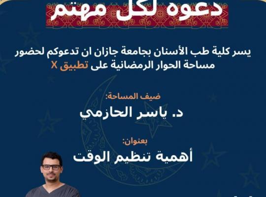 أطلقت كلية طب الأسنان يوم الأثنين ١٨ / ٣ / ٢٠٢٤ عبر تطبيق X برنامجها ( المساحة الرمضانية ) ، و كان عنوان المساحة الأولى ( أهمية تنظيم الوقت ) و ضيف اللقاء وكيل الكلية للشؤون الأكاديمية الدكتور ياسر بن علي الحازمي ، الذي استهل حديثه عن العادات الصحية