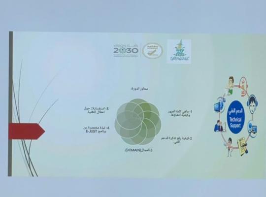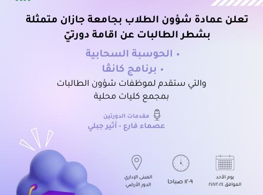 جامعة جازان: إدارة الإعلام نفذت عمادة شؤون الطلاب شطر الطالبات دورات تدريبية مستهدفة موظفات العمادة حول الحوسبة السحابية وبرنامج " كانفا" قدمتها الطالبتين عصماء فارع وأثير جبلي في المجمع الأكاديمي بمحلية. وتناولت الدورة الأولى الحوسبة السحابية