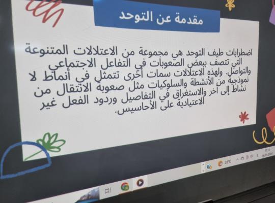 جامعة جازان: إدارة الإعلام نفذت وحدة خدمة المجتمع بالتعاون مع قسم التمريض في الكلية الجامعية بالداير فعالية اضطراب طيف التوحد تحت شعار (تقبلني كما أنا ) تضامناً مع اليوم العالمي للتوحد. واحتوت الفعالية على بوسترات ومنشورات وعرض فيديوهات حيث تم تعريف