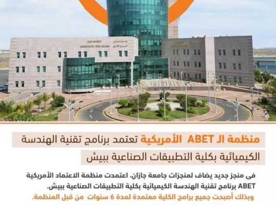 جامعة جازان: إدارة الإعلام في منجز جديد يضاف لمنجزات جامعة جازان، اعتمدت منظمة الاعتماد الأمريكية ABET برنامج تقنية الهندسة الكيميائية بكلية التطبيقات الصناعية ببيش وحصلت على الاعتماد الأكاديمي الدولي الكامل لتصبح بذلك جميع برامج الكلية الثلاثة تقنية