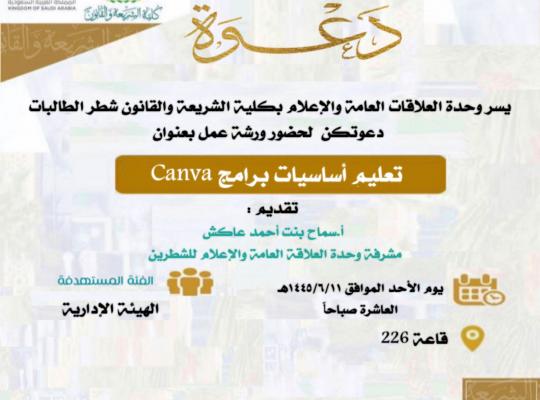 نفذت مشرفة وحدة العلاقات العامة والإعلام للشطرين الأستاذة سماح بنت أحمد عاكش ورشة عمل بعنوان تعليم أساسيات برنامج canva استهدفت فيها الطاقم الإداري حيث تناولت فيها عن كيفية عمل تصميمات العروض التقديمية وبطاقات الأعمال والشعارات والأنفوجرافيك، وكذلك