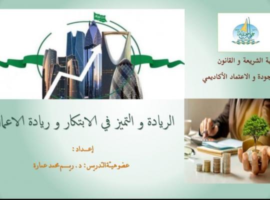 نفذت وحدة الجودة والاعتماد الأكاديمي بكلية الشريعة والقانون دورة بعنوان الريادة والتميز في الابتكار وريادة الأعمال قدمتها الدكتورة ريم عمارة عضو هيئة التدريس بقسم القانون تناولت فيها دور المملكة في تعزيز التميز والريادة في مجالات الابتكار وريادة