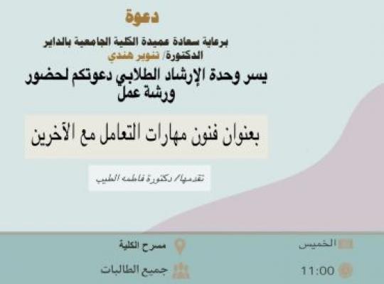 تحت رعاية سعادة عميدة الكلية الجامعية بالداير الدكتورة تنوير أحمد هندي قدمت وكالة الشؤون الأكاديمية ممثلة في وحدة الإرشاد الطلابي ورشة عمل بعنوان (فنون و مهارات التعامل مع الآخرين) وذلك في يوم الخميس الموافق 21\12\2023 بمسرح الكلية قدمتها الدكتورة/