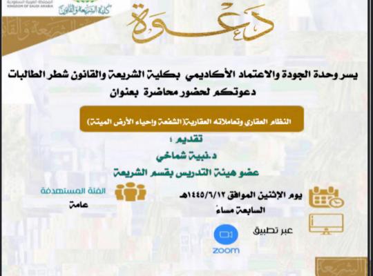 جامعة جازان: إدارة الإعلام نفذت وحدة الجودة والاعتماد الأكاديمي بكلية الشريعة والقانون شطر الطالبات محاضرة بعنوان النظام العقاري وتعاملاته العقارية (الشفعة -إحياء الأرض الميتة) قدمتها د. نبية شماخي عضو هيئة التدريس بقسم الشريعة تناولت فيها تعريف