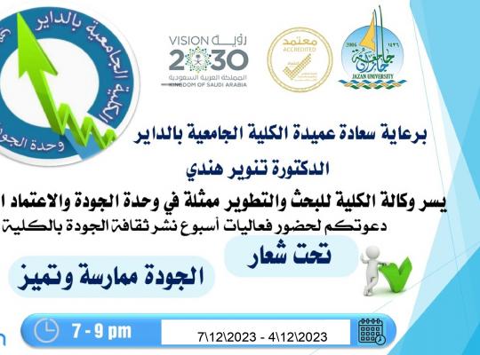 نظمت وكالة الكلية الجامعية بالداير للبحث والتطوير ممثلة في وحدة الجودة والاعتماد الأكاديمي فعاليات أسبوع نشر ثقافة الجودة بالكلية تحت شعار الجودة ممارسة وتميز عبر تطبيق الزووم برعاية عميدة الكلية الجامعية بالداير الدكتورة تنوير هندي. شملت الفعاليات