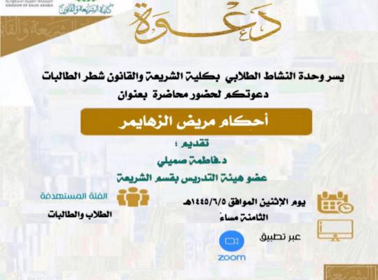 نفذت وحدة النشاط الطلابي بكلية الشريعة والقانون شطر الطالبات محاضرة بعنوان أحكام مريض الزهايمر قدمتها عضو هيئة التدريس بقسم الشريعة الدكتورة فاطمة بنت طاهر صميلي تناولت فيها التعريف بمرض الزهايمر ومراحله, وتعريف الأهلية وأقسامها مع ذكر بيان أحكام