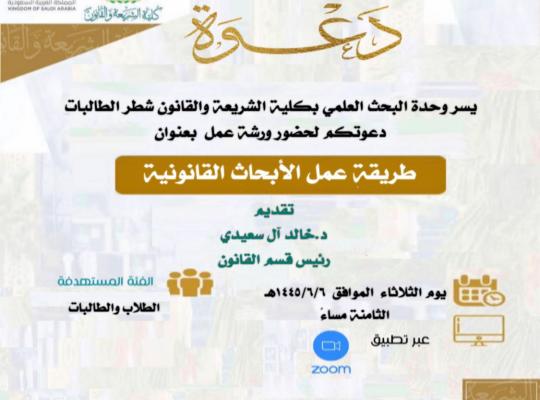 نفذت وحدة البحث العلمي بكلية الشريعة والقانون شطر الطالبات دورة تدريبية بعنوان طريقة عمل الأبحاث القانونية قدمها رئيس قسم القانون الدكتور خالد آل سعيدي تناول فيها التعريف بالأبحاث القانونية وكيفية إطلاع الطلاب بأهم مصادر الأبحاث القانونية وطريقة