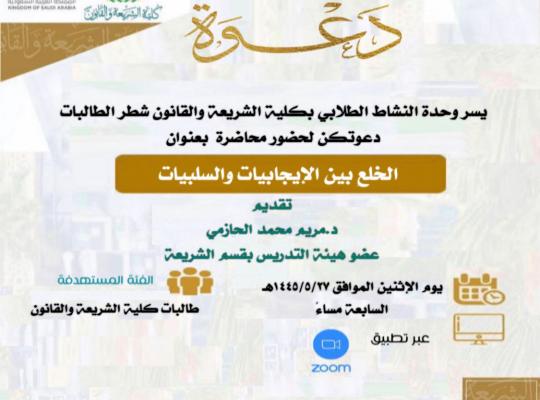 جامعة جازان: إدارة الإعلام نفذت وحدة النشاط الطلابي بكلية الشريعة والقانون شطر الطالبات محاضرة بعنوان الخلع بين الإيجابيات والسلبيات قدمتها الدكتورة مريم الحازمي عضو هيئة التدريس بقسم الشريعة. تناولت المحاضرة التعريف بمفهوم الخلع وحكمه وبيان الحكمة