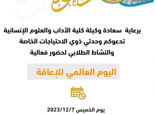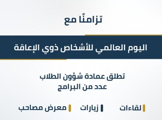 جامعة جازان: إدارة الإعلام أقامت جامعة جازان ممثلة في عمادة شؤون الطلاب شطر الطالبات احتفالاً بمناسبة اليوم العالمي للأشخاص ذوي الإعاقة ببهو المجمع الأكادي بمحلية برعاية وكيلة عمادة شؤون الطلاب شطر الطالبات الدكتورة رشا مشهور وحضور الإداريات