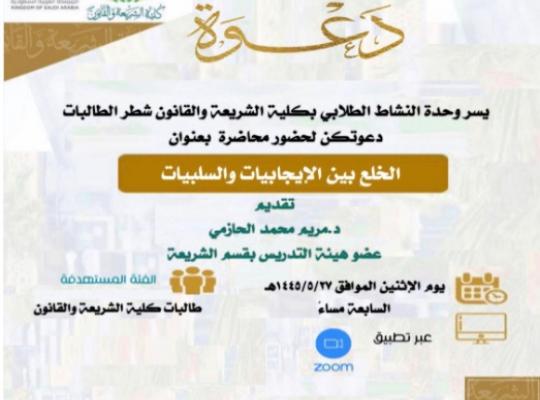 نفذت وحدة النشاط الطلابي بكلية الشريعة والقانون شطر الطالبات محاضرة بعنوان الخلع بين الإيجابيات والسلبيات قدمتها الدكتورة مريم الحازمي عضو هيئة التدريس بقسم الشريعة تناولت فيها تعريف الطالبة بمفهوم الخلع وحكمه وبيان الحكمة من مشروعيته والعوض فيه