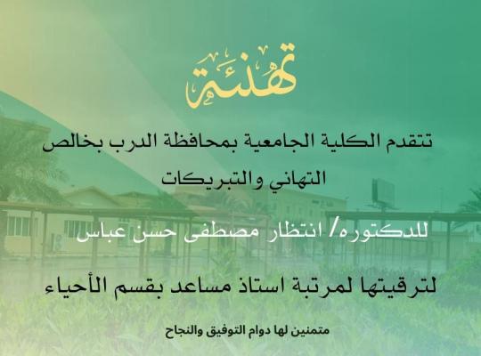 يتقدم قسم الاحياء بخالص التهاني والتبريكات الدكتورة انتظار مصطفي عباس لترقيتها لدرجة استاذ مساعد بقسم الاحياء ونتمني لها حياة عملية حافلة بالنجاحات