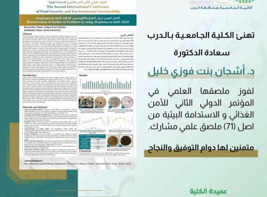 تهنيءعميدة الكلية الجامعية بالدرب سعادة الدكتورة اشجان بنت فوزي خليل قسم الاحياء لفوز ملصقها العلمي في المؤتمر الدولي الثاني للامن الغذائي والاستدامة البيئية من اصل (71 ) ملصق علمي مشارك متمنين لها دوام التوفيق والنجاح
