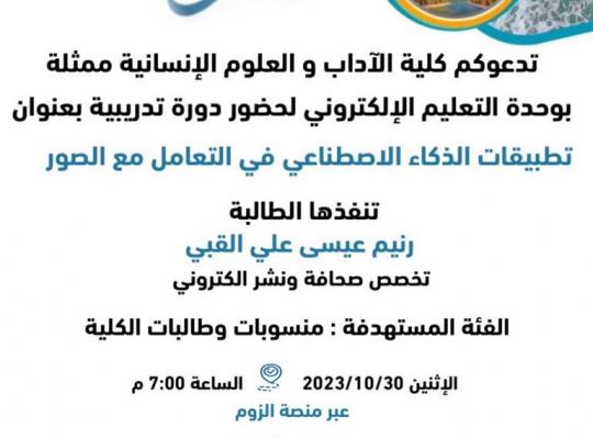 جامعة جازان: إدارة الإعلام عقدت كلية الآداب و العلوم الإنسانية( شطر الطالبات) ممثلة في وحدة التعليم الإلكتروني، دورة بعنوان "تطبيقات الذكاء الاصطناعي في التعامل مع الصور " نفذتها الطالبة/ رنيم عيسى علي القبي بقسم الصحافة و الإعلام تناولت من خلالها