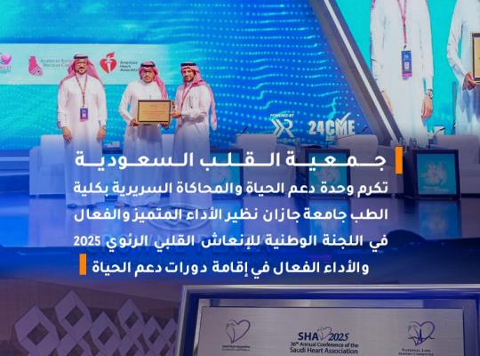 كرمت جمعية القلب السعودية وحدة دعم الحياة والمحاكاة السريرية بـ كلية الطب بالجامعة نظير الأداء المتميز في اللجنة الوطنية للإنعاش القلبي الرئوي 2025 ودورها الفعّال في إقامة دورات دعم الحياة لمجتمع جامعة جازان والمجتمع المحلي وذلك خلال المؤتمر السنوي