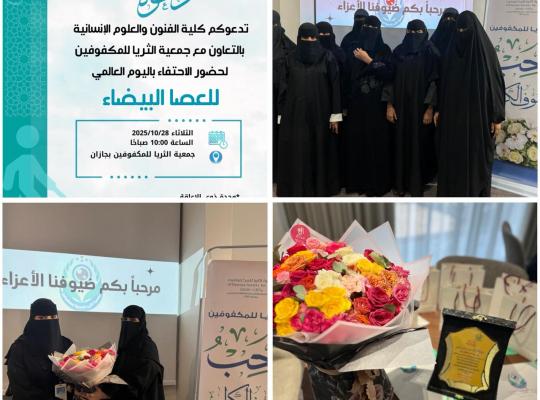 نظمت كلية الفنون والعلوم الإنسانية شطر الطالبات بالتعاون مع جمعية الثريا للمكفوفين احتفاؤها السنوي باليوم العالمي للعصا البيضاء وذلك بتوجيه وإشراف وكيلة الكلية الدكتورة فاطمة محمد بريك ، وتنفيذ وحدات ذوي الإعاقة والأنشطة الطلابية وخدمة المجتمع