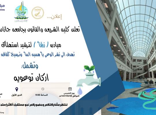 في إطار جهود كلية الشريعة والقانون نحو تعزيز الاستدامة البيئية والمساهمة في تحقيق أهداف وزارة البيئة والمياه والزراعة والجهود الوطنية لترشيد استهلاك المياه، فعلت الكلية مبادرة «مبادرة زرقاء» لترشيد استهلاك المياه وقد شملت الفعالية إقامة أركان توعوية