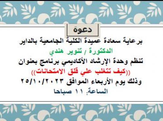 جامعة جازان: إدارة الإعلام نظمت الكلية الجامعية بالداير ممثلة بوحدة الإرشاد الطلابي برنامجا بعنوان ( اختبري بدون قلق ) قدمتها الدكتورة أم سلمه أحمد تحدثت عن كل ما يثير القلق وقت الاختبارات كما بينت الفرق بين الخوف والقلق, وذكرت أنواع القلق وتم