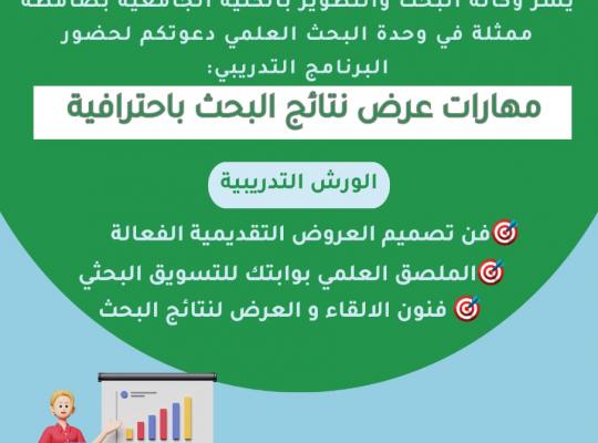 جامعة جازان: إدارة الإعلام نفذت وكالة البحث والتطوير بالكلية الجامعية بصامطة (سابقاً) ممثلة في وحدة البحث العلمي البرنامج التدريبي "مهارات عرض نتائج البحث باحترافية" والذي يضم ثلاث ورش تدريبية لتطوير مهارات التصميم والعرض الفعال لنتائج البحث لدى