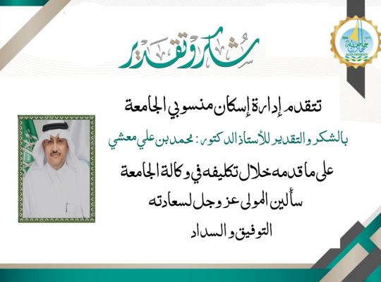 تتقدم إدارة إسكان منسوبي الجامعة بالشكر والتقدير للأستاذ الدكتور محمد بن علي معشي على ماقدمة خلال تكليفه في وكالة الجامعة سألين المولى عزوجل لسعادته التوفيق والسداد