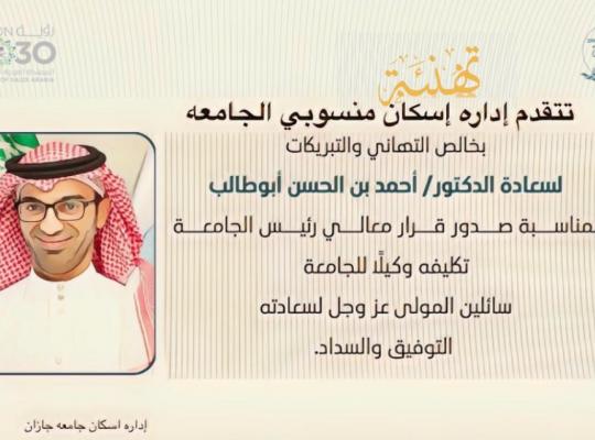 تتقدم إدارة إسكان منسوبي الجامعة التهنئية لسعادة وكيل الجامعة د. أحمد بن الحسن أبو طالب صدور قرار معالي رئيس الجامعة تكليفة وكيلاً للجامعة سائلين المولى عزوجل لسعاده التوفيق والسداد