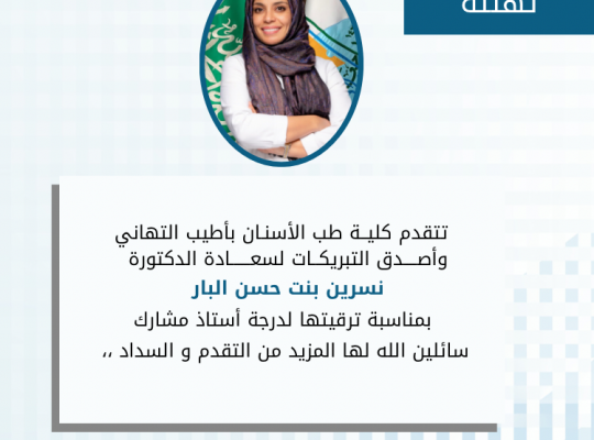 صدر يوم الأربعاء الحادي عشر من أكتوبر قرار موافقة رئيس جامعة جيزان الدكتور مرعي القحطاني على الترقية العلمية للدكتورة نسرين بنت حسن البار عميدة كلية طب الأسنان إلى درجة أستاذ مشارك ،، و يأتي ذلك ضمن قرار ترقية عدد من اعضاء هيئة التدريس بجامعة جازان و