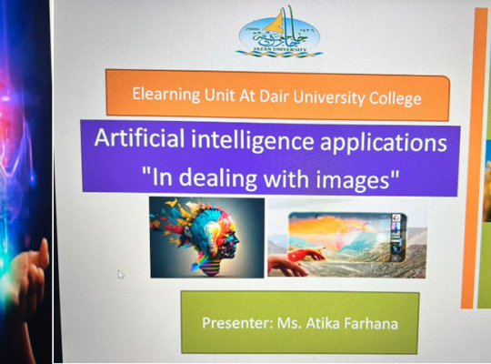 برعاية عميدة الكلية الجامعية بمحافظة الداير د. تنوير احمد هندي قدمت وحدة التعليم الالكتروني ورشة بعنوان (تطبيقات الذكاء الاصطناعي في تصميم الصور ) وذلك يوم الأربعاء 27\9\2023 قدمتها د. عاتكة فرحان وقد شملت المحاضرة على تعريف الذكاء الاصطناعي وأهميته