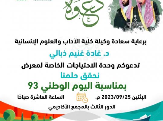 جامعة جازان: إدارة الإعلام أقامت كلية الآداب والعلوم الإنسانية شطر الطالبات معرض " نحقق حلمنا " تحت رعاية وكيلة الكلية د. غادة غنيم ذبالي وذلك تزامنا مع احتفالات اليوم الوطني الثالث والتسعين ، والذي نفذته وحدة ذوي الاحتياجات الخاصة بالكلية ، حيث