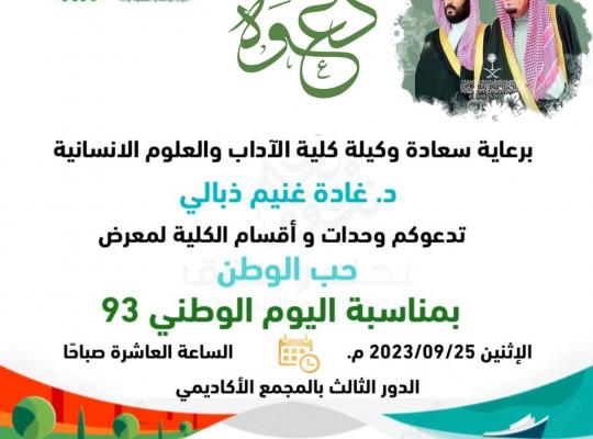 جامعة جازان: إدارة الإعلام احتفت كلية الآداب والعلوم الإنسانية شطر الطالبات باليوم الوطني الثالث والتسعين وذلك بإقامة معرض " حب الوطن " برعاية وكيلة الكلية د. غادة غنيم ذبالي، بالتعاون بين أقسام و وحدات الكلية المختلفة. وقد اشتمل المعرض على مجموعة من