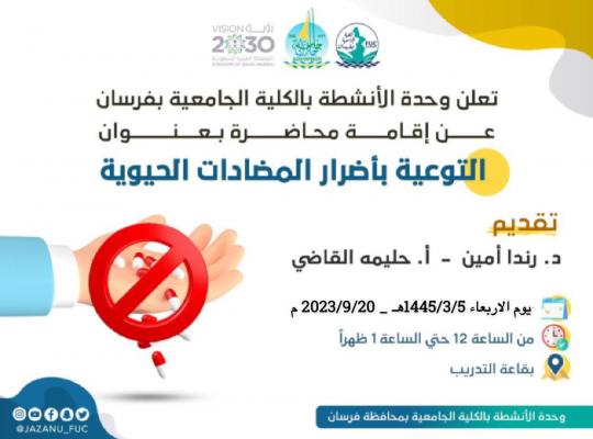 نفذت الكلية الجامعية بفرسان ممثلة في وحدة الأنشطة الطلابية برعاية عميدة الكلية الدكتورة عفاف محمد با بعير وإشراف وكيلة الكلية للشؤون الأكاديمية الدكتورة عيش يحيى مدخلي محاضرة بعنوان: التوعية بأضرار المضادات الحيوية، من إعداد وتنفيذ الدكتورة رنده أمين