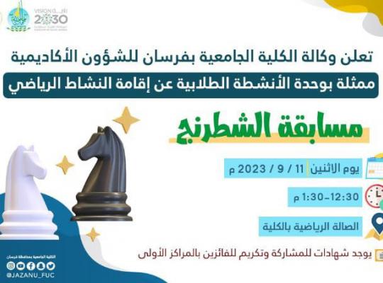 قامت الكلية الجامعية بفرسان ممثلة في وحدة الأنشطة الطلابية برعاية عميدة الكلية الدكتورة عفاف محمد با بعير وإشراف وكيلة الكلية للشؤون الأكاديمية الدكتورة عيش يحيى مدخلي مسابقة رياضية في لعبة الشطرنج من إعداد وتنفيذ مشرفة الصالة الرياضية الموظفة فاطمة