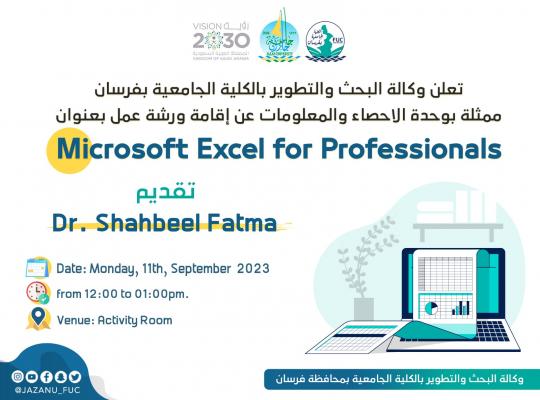جامعة جازان: إدارة الإعلام عقدت الكلية الجامعية بفرسان ممثلة في وحدة مصادر التعليم والتعلم برعاية عميدة الكلية ورشة عمل حول مايكروسوفت إكسل للمحترفين من إعداد وتنفيذ الدكتورة شهبيل فاطمة سيد أستاذ مساعد بقسم التمريض. تناولت الورشة عدة جوانب أبرزها: (