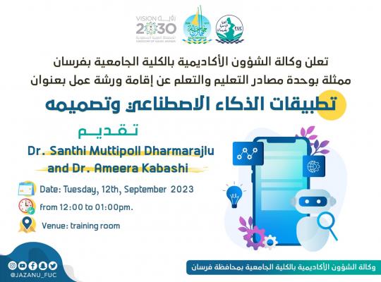 جامعة جازان: إدارة الإعلام أقامت الكلية الجامعية بفرسان ممثلة في وحدة التعلم والتعليم الالكتروني برعاية عميدة الكلية الدكتورة عفاف محمد با بعير ورشة عمل بعنوان: تطبيقات الذكاء الاصطناعي في تصميم العروض التقديمية، نفذتها الدكتورة سانتي ميتبول