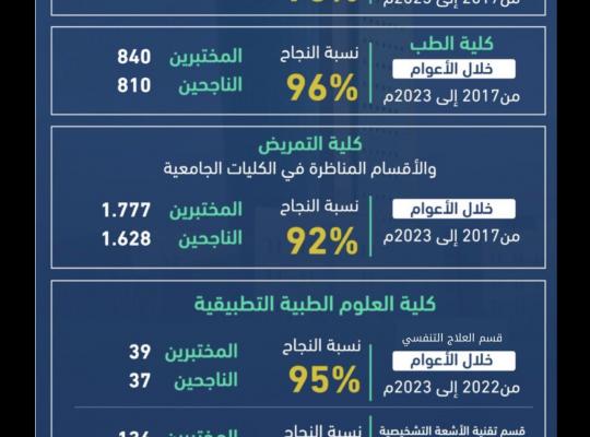 حققت كلية طب الأسنان المركز الأول بين الكليات الصحية بجامعة جازان وذلك في اختبارات الهيئة السعودية للتخصصات الصحية ، خلال الأعوام من 2017 إلى 2023 بنسبة نجاح %98 . ومن جهته هنىء معالي رئيس الجامعة د. مرعي بن حسين القحطاني الكلية حصولها هذا المركز