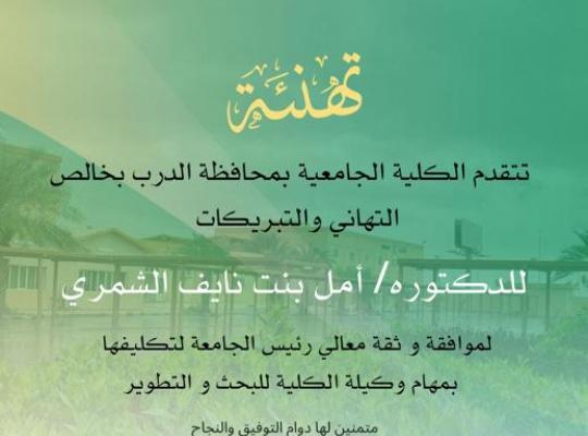 يتقدم قسم الاحياء كلية الدرب بخالص التهاني والتبريكات للدكتورة امل الشمري لموافقة وثقة معالي رئيس الجامعة لتكليفها بمهام وكيلة الكلية للبحث والتطوير متمنين لها دوام التوفيق
