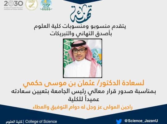 يتقدم منسوبو ومنسوبات كلية العلوم بأصدق التهاني والتبريكات لسعادة الدكتور/ عثمان بن موسى حكمي بمناسبة صدور قرار معالى رئيس الجامعة بتعيين سعادته عميدا لكلية العلوم. راجين المولى عز وجل له دوام التوفيق والعطاء