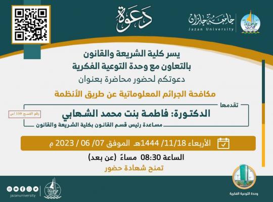 يسر #جامعة_جازان ممثلة بكلية الشريعة والقانون، بالتعاون مع وحدة التوعية الفكرية دعوتكم لحضور محاضرة بعنوان: مكافحة الجرائم المعلوماتية عن طريق الأنظمة. يوم غد الأربعاء 1444/11/18هـ الساعة 8:30 مساءً، عن طريق (الزوم) على الرابط التالي: https://zoom.us