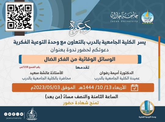 تعلن #جامعة_جازان ممثلة بالكلية الجامعية بالدرب، بالتعاون مع وحدة التوعية الفكرية دعوتكم لحضور ندوة: الوسائل الوقائية من الفكر الضال. يوم غد الأربعاء 1444/10/13هـ الساعة 8:30م (عن بُعد) على الرابط التالي: https://zoom.us/j/97306542099