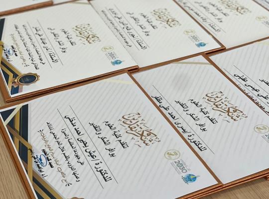 برعاية وكيلة كلية العلوم د. آمنه عيسى شماخي أقامت كلية العلوم حفل تكريم للمتعاقدات الذين أنهو خدمتهم بعد مسيرة حافلة بالعطاء والتضحية في كلية العلوم ، حيث يُعد هذا التكريم بمثابة وفاء وعرفان لما بذلوه من جهود في إنجاز الرسالة النبيلة الموكلة إليهم