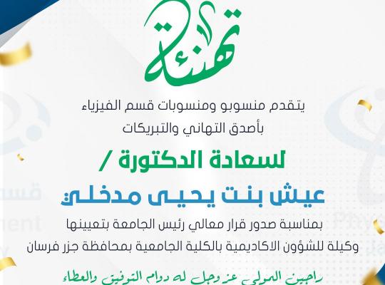 صدر قرار معالي رئيس الجامعة بتعيين لسعادة الدكتورة / عيش بنت يحيي مدخلي وكيلة للشؤون الأكاديمية بالكلية الجامعية بمحافظة جزر فرسان. وبهذه المناسبة يتقدم منسوبو ومنسوبات قسم الفيزياء بأصدق التهاني والتبريكات لسعادة الدكتورة / عيش مدخلي متمنيا لها دوام