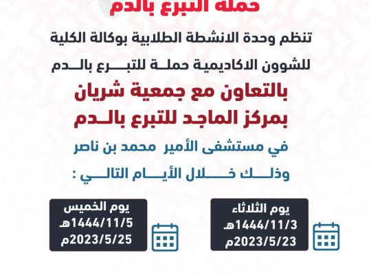 الحملة النسائية للتبرع بالدم لكلية العلوم الطبية التطبيقية بالتعاون مع جمعية رعاية مرضى الدم بمنطقة جازان شريان نظمت وحدة الانشطة الطلابية بوكالة الشؤون الأكاديمية بشطر الطالبات ((حملة التبرع بالدم )) بالتعاون مع جمعية شريان بمركز الماجد لتبرع بالدم