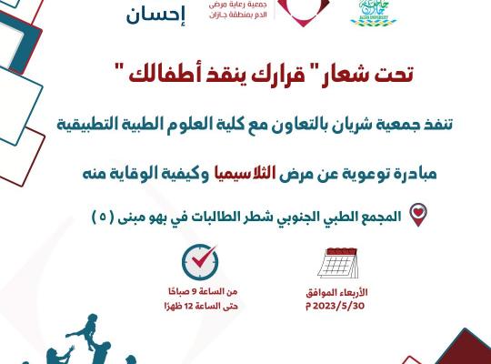 نظمت وحدة أمراض الدم بكلية العلوم الطبية التطبيقية شطر الطالبات بالتعاون مع جمعية رعاية مرضى الدم بمنطقة جازان (شريان) فعالية اليوم العالمي لمرضى الثلاسيميا تحت شعار قرارك ينقذ أطفالك يوم الأربعاء الموافق ١١ / ١١ /١٤٤٤هـ ببهو مبنى (٥) في المجمع