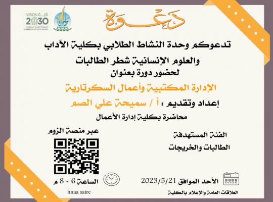 جامعة جازان: إدارة الإعلام في إطار إعداد الطالبات الدخول سوق العمل، عقدت كلية الآداب والعلوم الإنسانية شطر الطالبات، بإشراف وحدة النشاط الطلابي، دورة بعنوان( الإدارة المكتبية وأعمال السكرتارية) أعدتها وقدمتها الأستاذة سميحة الصم المحاضر بكلية إدارة