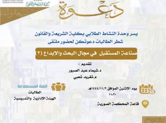 جامعة جازان: إدارة الإعلام برعاية وكيلة كلية الشريعة والقانون شطر الطالبات أ.د زكرية بنت أحمد غلفان زكري نفذت وحدة النشاط الطلابي ملتقى صناعة المستقبل في دورته الثالثة بعنوان صناعة المستقبل في مجال البحث والإبداع تضمن بعض النماذج لطالبات تميزن في