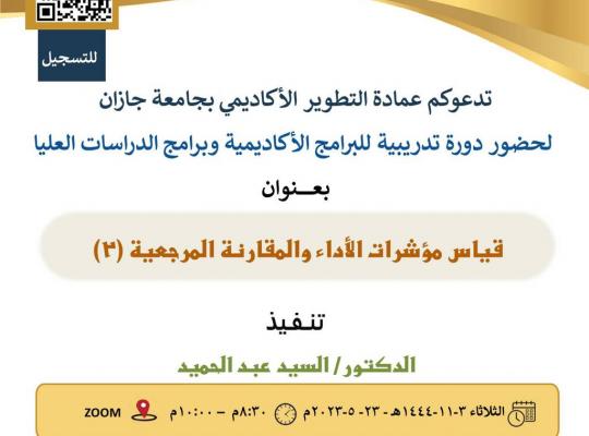 جامعة جازان: إدارة الإعلام نظمت عمادة التطوير الأكاديمي ورشة عمل قياس مؤشرات الأداء والمقارنة المرجعية للبرامج الأكاديمية عبر برنامج ZOOM نفذها الدكتور السيد عبد الحميد مستشار عمادة التطوير الأكاديمي، بحضور عميد التطوير الأكاديمي الدكتور علي هندي،