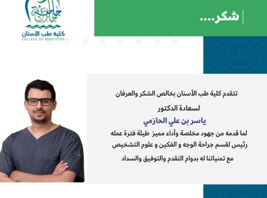 يتقدم منسوبي الكلية بأصدق عبارات الشكر و العرفان للدكتور ياسر بن علي الحازمي على ما قدمه من جهود ملموسه خلال تكليفه رئاسة قسم جراحة الوجه و الفكين وعلوم التشخيص بالكلية شاكرين له هذا السعي مثمنين هذه الجهود و متمنين له دوام التوفيق و السداد،،