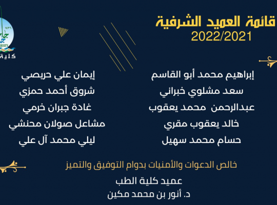 تتقدم كلية الطب بأجمل التهاني والتبريكات لأطباء وطبيبات الامتياز حصولهم على قائمة العميد الشرفية للعام الأكاديمي 2022/2021 متمنين لهم دوام التوفيق والتميز.