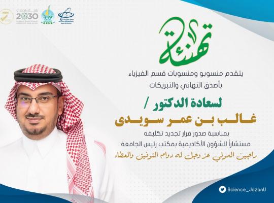 صدر قرار معالي رئيس الجامعة بالموافقة على تجديد تكليف الدكتور غالب سويدي مستشارًا لرئيس الجامعة ألف مبروك للدكتور غالب في ثقة معالي رئيس الجامعة ونسال الله لكما التوفيق و السداد.