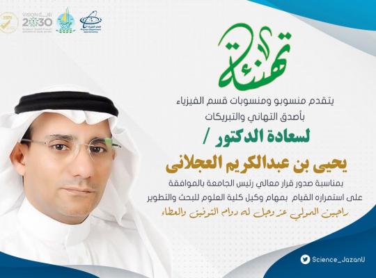 صدور قرار معالي رئيس الجامعة بالموافقة على استمرار الدكتور يحيى العجلاني للقيام بمهام وكيل كلية العلوم للبحث والتطوير. مبارك سعادة الدكتور يحيى بالتوفيق مزيد من التقدم والانجازات
